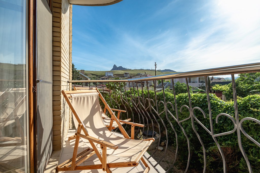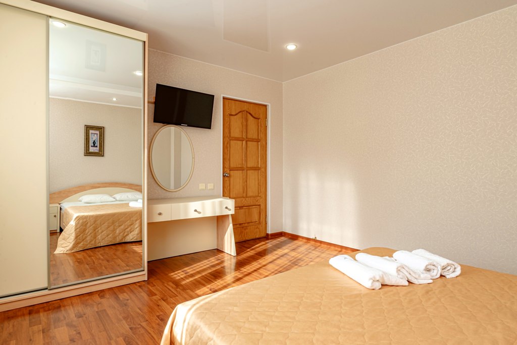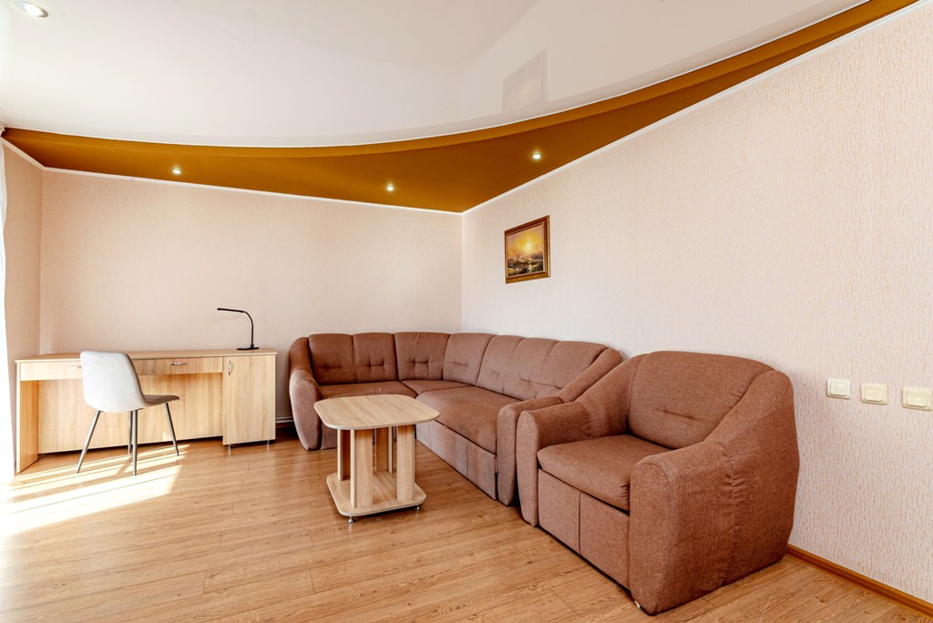 Просторный двухкомнатный номер - это 44 м2 безупречного отдыха. В гостиной, выполненной голубых тонах, расположен угловой диван лицом к панорамному окну и выходу на балкон. Пастельные тона спальной создают атмосферу уюта и комфорта. Номер рассчитан на 4 отдыхающих с возможностью дополнительного размещения еще 1 человека. ✓ Одна двуспальная кровать. ✓ Угловой диван и кресло-кровать. ✓ Санузел: душевая кабина, умывальник, туалет. ✓ Просторный балкон с сушилкой для белья. ✓ Кондиционер. ✓ Отопление. ✓ Шкаф-купе со встроенным сейфом. ✓ ТВ (кабельное телевидение). ✓ Холодильник. ✓ Прикроватные тумбочки и журнальный столик. ✓ Покрытие полов - ламинат в гостиной и ковролин в спальне. ✓ Полотенца: душ - 3 шт., лицо - 3 шт., ноги - 3 шт., для бассейна - 3 шт. ✓ Одноразовые принадлежности для душа - гель, шампунь, мыло. Тапочки, халаты. ✓ Фен.